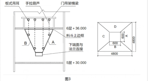 某生物新材料项目由A公司总承包,A公司项目部经理在策划组织机构时,项目部根据项目的大小和具体情况配备了项目部技术人员,满足了技术管理要求。项目中的料仓盛装的浆糊流体介质温约42°℃,料仓外壁保温材料为半硬质岩棉材料。料仓由ABCD四块不锈钢壁板组焊而成。尺寸和安装位置如图3所示。门吊架横梁上挂设4只手拉葫芦,通过卸扣、钢丝绳吊索与料仓壁板上吊耳(材料为Q235)连接成吊装系统。料仓的吊装顺序为:A、C→B、D;料仓四块不锈钢焊接方法是焊条电弧焊。设计要求:料仓正方形出料口连接法兰安装水平允许偏差≤1mm,对角线允许偏差≤2mm,中心位置允许偏差≤1.5mm。料仓工程质量检查时,质量员提出吊耳与料仓壁板为异种钢焊接,违反"禁止不锈钢与碳素钢接触”的规定。项目部对料仓临时吊耳进行了标识和记录,根据材质和严重程度编制并提交了质量问题调查报告,及时返修后,质量验收合格。