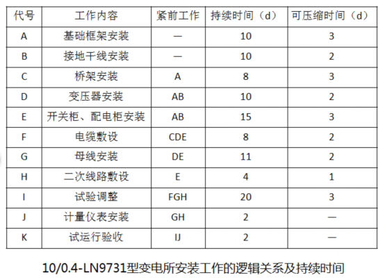 1、按表计算变电所安装计划工期,如果每项工作都按表压缩天数,变电所安装最多可以压缩到多少天?
