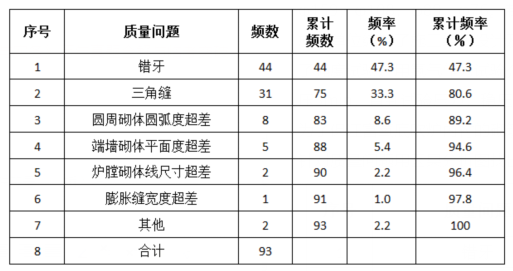 为了保证富氧底吹炉内衬的砌筑质量,施工单位对砌筑过程中的质量问题进行了现场调查并统计了质量问题(见下表),针对质量问题用因果分析图找出了主要原因。