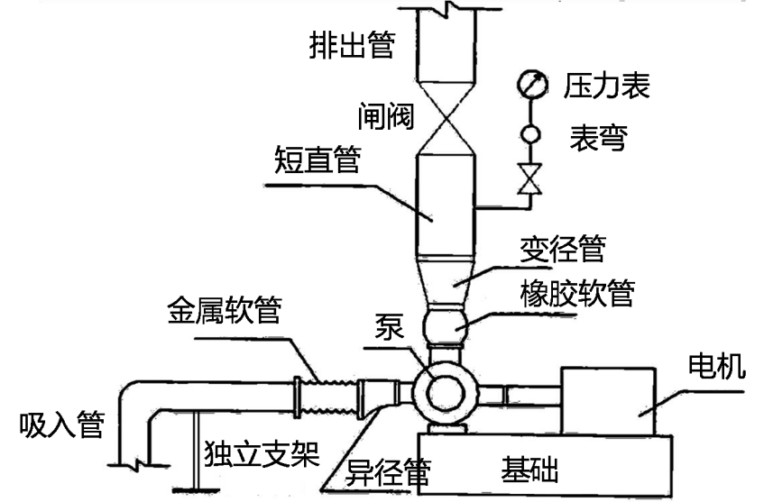 某工业安装工程项目,工程内容:工艺管道、设备、电气及自动化仪表安装调试,工程的循环水泵为离心泵,二用一备。泵的吸入和排出管道上均设置了独立、牢固的支架。泵的吸入口和排出口均设置了变径管,变径管长度为管径差的6倍,泵的水平吸入管向泵的吸入口方向倾斜,倾斜度为8‰,泵的吸入口前直管段长度为吸入口直径的5倍,水泵扬程为80米。
