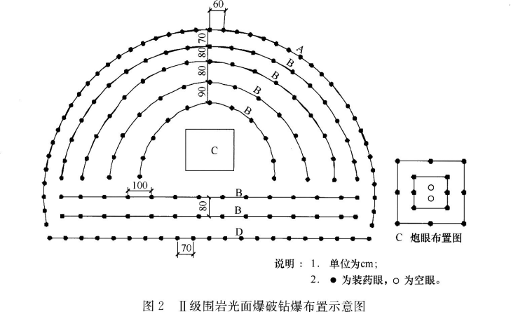 事件2:项目经理部编制了Ⅱ级围岩全断面开挖光面爆破方案,其中钻爆布置如图2所示。