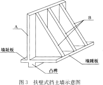 某段铁路路基工程,主要施工内容有路堑土石方开挖、路堤填筑及附属工程。其中,路堑段长度140m,地面最大横向坡度1:10,路堑开挖最大深度20m;路堤地基处理设计采用铺设一层土工合成材料加筋垫层;路堤邻近营业线一侧支挡设计采用扶壁式挡土墙,挡土墙结构如图3所示;部分路基边坡设计采用浆砌片石“人”字形骨架进行防护。新建路堤坡脚距离营业线坡脚最小距离为5m,施工期间营业线正常运营。