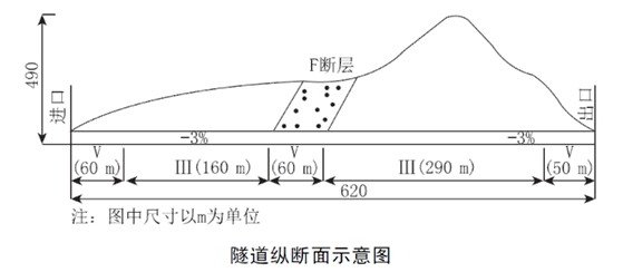 某双车道公路隧道。全长620m,地层岩性为石灰岩,地下水较丰富。有一条F断层破裂带,隧道最大埋深490m,纵坡为-3%。其围岩级别及长度见隧道纵断面示意图3。合同总工期为20个月。