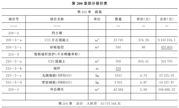 事件2:投标人甲的总报价为6800.022万元,其中第200章部分报价单见表4。在评标过程中,评标委员会发现,清单中细目209-3-c的单价与数量的乘积与合价不致,细目210-3-b中,招标人给定了锚杆的工程量是256m,投标人甲没有填写单价和合价。锚杆的市场综合单价为55.06元/m。其他部分的计算均正确。评标委员会按照偏差修正的有关原则对偏差进行了修正,并征得投标人甲的同意。最终投标人甲以修正后的报价中标并签订合同。