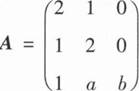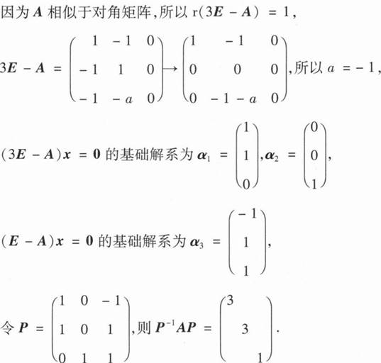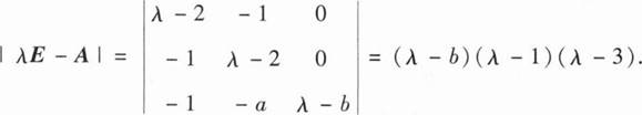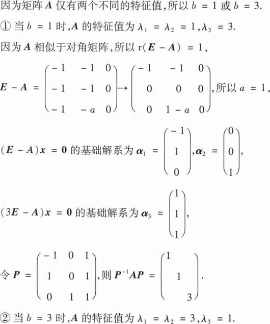 仅有两个不同的特征值,若A相似于对角矩阵,求a,b的值,并求可逆矩阵P,使P-1AP为对角矩阵.