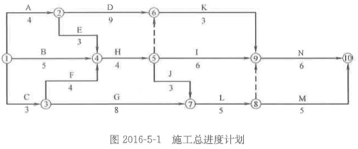 1、确定图5-1施工总进度计划的总工期及关键工作,计算工作G的总时差。