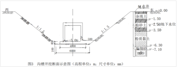 33、项目部承建郊外新区一项钢筋混凝土排水箱涵工程,全长800m,结构尺寸为3.6m(宽)x3.8m(高),顶板厚400mm,侧墙厚300mm,底板为厚400mm的外拓反压抗浮底板,箱涵内底高程为-5.0m,C15混凝土垫层厚100mm,详见图3。地层由上而下为杂填土厚1.5m,粉砂土2.0m,粉质黏土2.8m,粉细砂0.8m,细砂2m,地下水位于标高-2.5m处。事件一:箱涵的沟槽施工采用放坡明挖法,边坡依据工程地质情况设计为1:1.5,基底宽度6m。项目部考虑在沟槽西侧用于钢筋和混凝土运输,拟将降水井设置在东侧坡顶2m外,管井间距为8m。沟槽开挖和降水专项施工方案已组织专家论证,专家指出降水方案存在降水井布局不合理、缺少沟槽降排水防护措施等问题,项目部按专家建议对专项施工方案做了修改。事件二:项目部制定的每段20m箱涵施工流程为:沟槽开挖→坑底整平→垫层施工→钢筋绑扎→架设模板→浇筑箱涵混凝土→回填。事件三:项目部对①土方、渣土运输的车辆、②现场出入口处和社会交通路线、③施工现场主要道路、料场、生活办公区、④裸露的场地和集中堆放的土方制定了具体的扬尘污染防治措施。