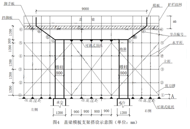34、某公司承建一项城市桥梁工程,设计为双幅分离式四车道,下部结构为墩柱式桥墩,上部结构为简支梁。该桥盖梁采取支架法施工,项目部编制了盖梁支架模板搭设安装专项方案。包括如下内容:采用盘扣式钢管满堂支架;对支架强度进行计算,考虑了模板荷载,支架自重和盖梁钢筋混凝土的自重;核定地基承载力;对支架搭设范围的地面进行平整预压后搭设支架。盖梁模板支架搭设示意如图4。架子工未完成全部斜撑搭设被工长查出要求补齐。现场支架模板安装完成后,项目部拟立即开始混凝土浇筑,被监理叫停下达了暂停施工通知,并提出整改要求。