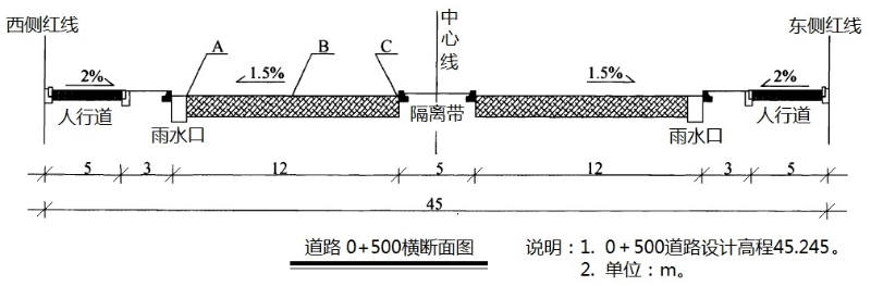 1、道路横断面图中,道路设计高程是指A、B、C当中哪一个具体位置?在实际当中,路宽是否包括路缘石的宽度?