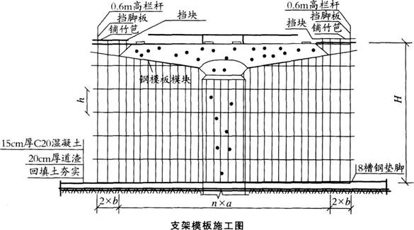 项目部编制了桥墩专项施工方案,方案中采用扣件式钢管支架及定型钢模板。为了加强整体性,项目部将支架与脚手架一体化搭设,现场采用的支架模板施工图如下图所示。