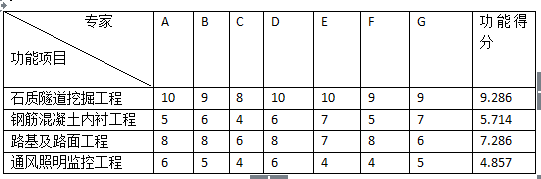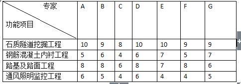 2、某设计院承担了长约1.8公里的高速公路隧道工程项目的设计任务。为控制工程成本,拟对选定的设计方案进行价值工程分析。专家组选取了四个主要功能项目,7名专家进行了功能项目评价,其打分结果见表2.1。