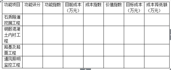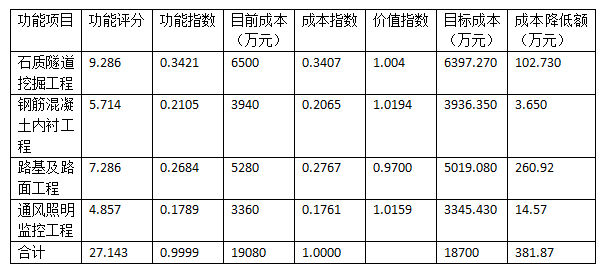 4. 成本降低额从大到小排序为路基及路面工程、石质隧道挖掘工程、通风照明监控工程、钢筋混凝土内衬工程。所以功能改进的前两项分别为路基及路面工程、石质隧道挖掘工程。