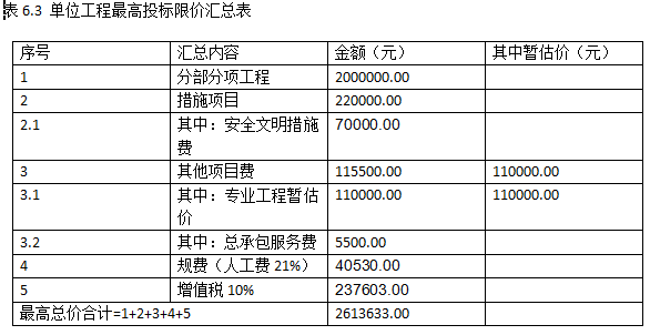 3.假定该整体烟囱分部分项工程费为2000000.00元;单价措施项目费为150000.00元,总价措施项目仅考虑安全文明施工费,安全文明施工费按分部分项工程费的3.5%计取;其他项目考虑基础基坑开挖的土方、护坡、降水专业工程暂估价为110000.00元(另计5%总承包服务费);人工费占比分别为分部分项工程费的8%、措施项目费的15%;规费按照人工费的21%计取,增值税税率按10%计取。按《建设工程工程量清单计价规范》(GB50584-2013)的要求,在答题卡中列示计算安全文明施工费、措施项目费、人工费、总承包服务费、规费增值税;并在答题卡表6.3“单位工程最高投标限价汇总表”中编制该钢筋混凝土多管式(钢内筒)烟囱单位工程最高投标限价。