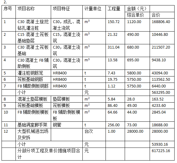 2.根据问题1的计算结果,及答题卡表6.2中给定的信息,按照《建设工程工程量清单计价表规范》(GB50584-2013)的要求,在答题卡表6.2“分部分项工程和单价措施项目清单与计价表”中,编制该烟囱钢筋混凝土基础分部分项工程和单价措施项目凊单与计价表。
