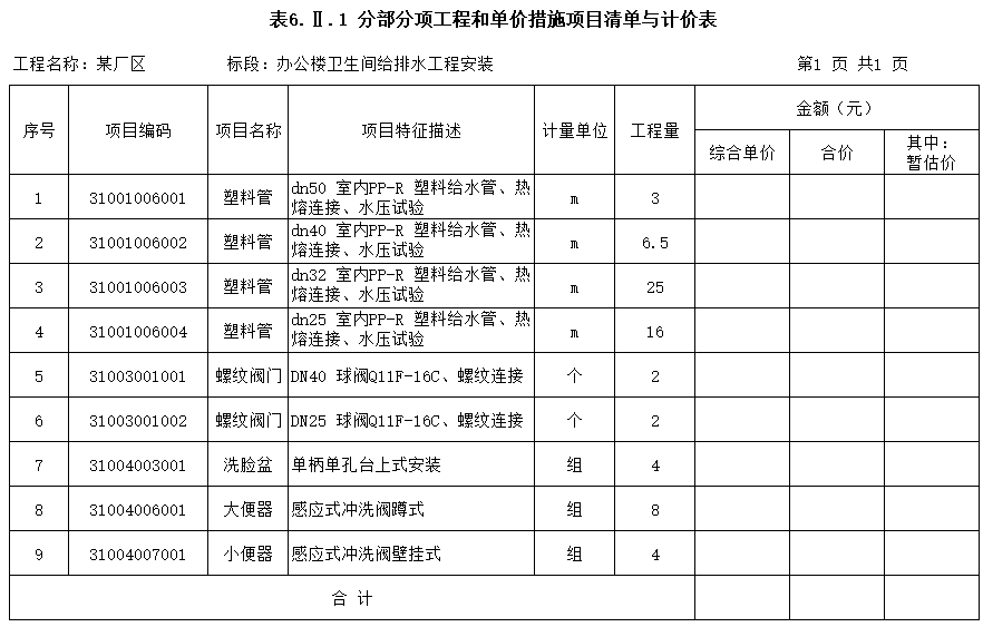2.假设按规定计算的该卫生间给水管道和阀门部分的清单工程量如下: