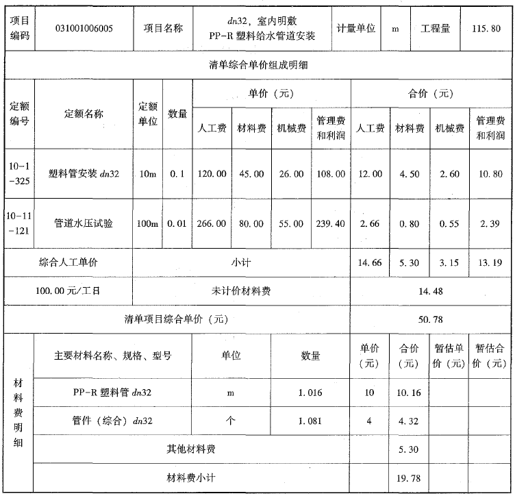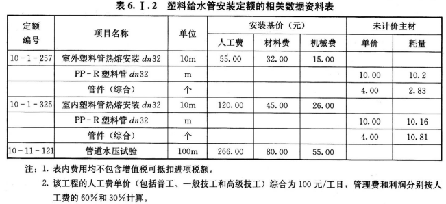 3.按照背景资料2、3、4中的相关数据和图6.I.1、6.I.2中所示要求,根据《通用安装工程工程量计算规范》GB50856—2013、《建设工程工程量清单计价规范》GB50500—2013和《通用安装工程消耗量定额》TY02-31-2015的规定,编制室内dn32PP-R塑料给水管道分部分项工程量清单的综合单价,并填入答题卡表6.I.4“综合单价分析表”中。