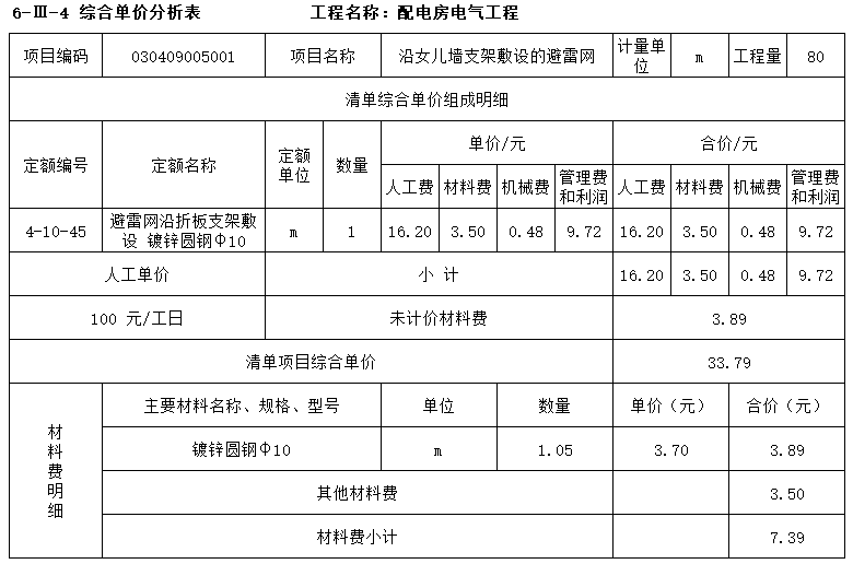 2.假定该工程“沿女儿墙敷设的避雷网”清单工程量为80m,其余条件均不变,根据背景资料2中的相关数据,编制完成答题卡表6..2“综合单价分析表”。
