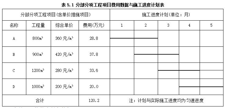 5、某工程项目发承包双方签订了工程施工合同,工期5个月,合同约定的工程内容及其价款包括,分部分项工程项目(含单价措施项目)4项。费用数据与施工进度计划见表5.1;总价措施项目费用10万元(其中含安全文明施工费为6万元);暂列金额费用5万元;管理费和利润为不含税人材机费用之和的12%;规费为不含税人材机费用与管理费、利润之和的6%;增值税税率为10%。