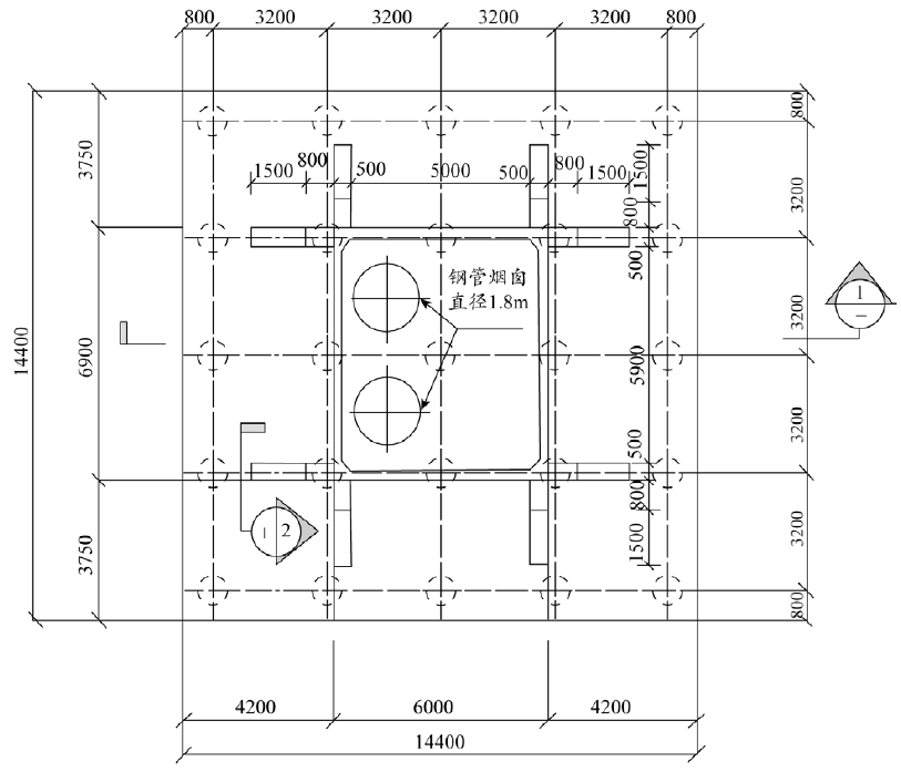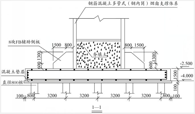 ②FB辅助侧板为基础的一部分,待钢筋混凝土多管式烟囱筒身滑升部分高度后实施。