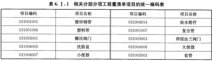 3.给排水工程相关分部分项工程量清单项目的统一编码见表6.I.1.