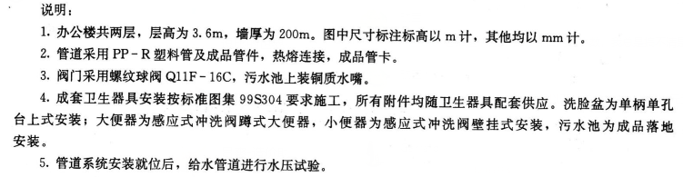 PP-R塑料管:dn50,直埋3.0m;dn40,直埋5.0m,明设1.5m;dn32,明设25m;dn25,明设16m。阀门Q11F-16C:DN40:2个;DN25:2个。