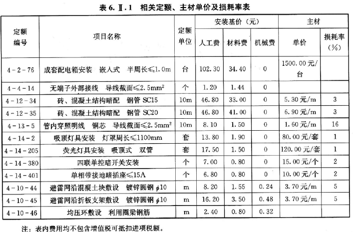 2.该工程的相关定额、主材单价及损耗率见表6.Ⅱ.1.