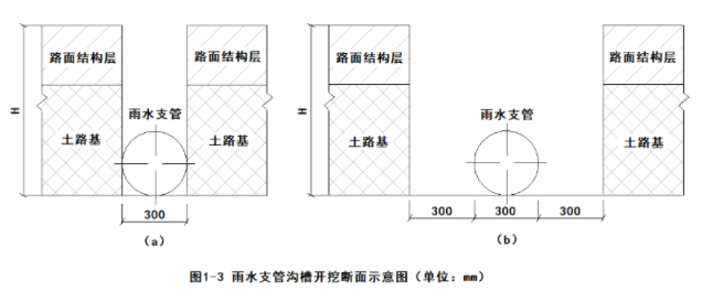 事件二:基层验收合格后,项目部采用开槽法进行DN300mm的雨水支管施工,雨水支管沟槽开挖断面如图1-3所示。槽底浇筑混凝土基础后敷设雨水支管,最后浇筑C25混凝土对支管进行全包封处理。