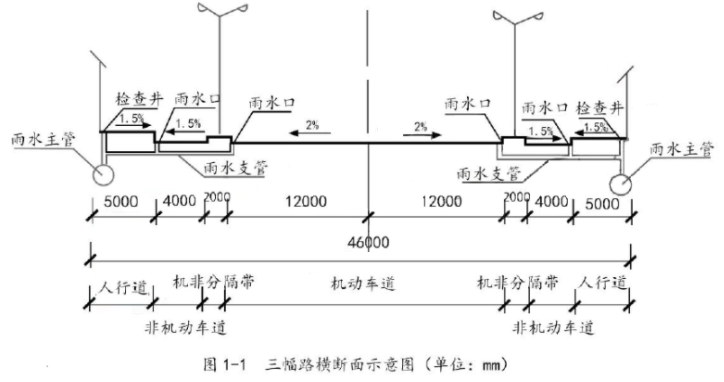 某单位承建一钢厂主干道钢筋混凝土道路工程,道路全长1.2km,红线宽46m,路幅分配如图1-1所示,雨水主管敷设于人行道下,管道平面布置如图1-2所示。该路段地层富水,地下水位较高,设计单位在道路结构层中增设了200mm厚级配碎石层,项目部进场后按文明施工要求对施工现场进行了封闭管理,并在现场进口处挂有“五牌一图”。