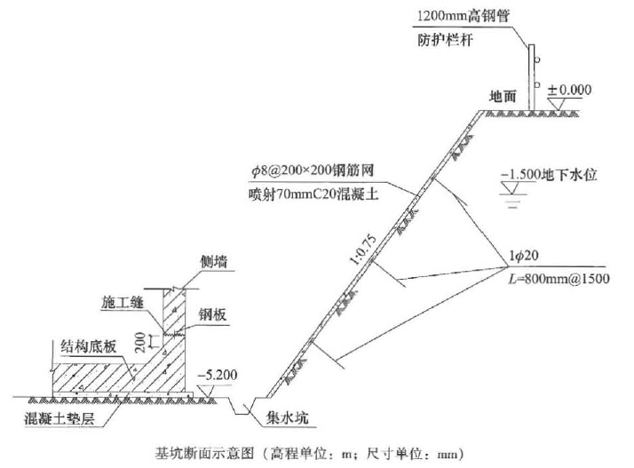 因结构施工恰逢雨期,项目部采用1:0.75放坡开挖,挂钢筋网喷射C20混凝土护面,施工工艺流程如下:修坡→C→挂钢筋网→D→养护。