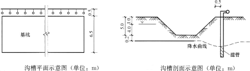 某施工单位承接了一项市政排水管道工程,基槽采用明挖法放坡开挖施工,机械开挖,采用水泥抹面进行护坡。基槽宽度为6.5m,开挖深度为5m,场地内地下水位于地表下1m,施工单位拟采用轻型井点降水,真空井滤料上方使用A封堵。井点的布置方式和降深等示意图如下: