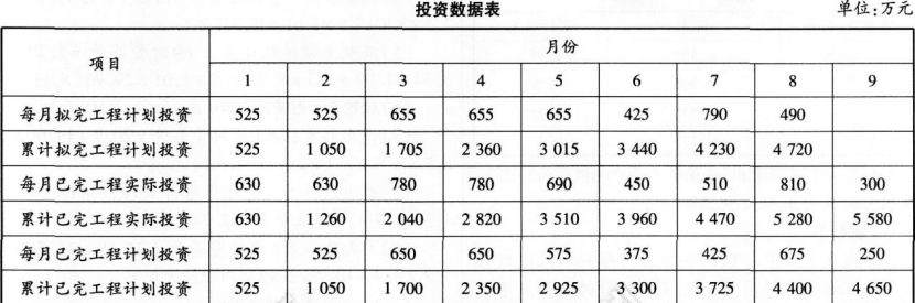 3.8月末进度偏差=已完工程计划投资-拟完工程计划投资=4400-4720=-320(万元),进度滞后320万元。8月末投资偏差=已完工程计划投资-已完工程实际投资=4400-5280=-880(万元),投资超支880万元。