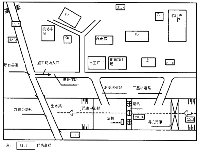 1.根据有利生产、方便生活、易于管理、安全可靠的原则,指出示意图中代号中①、②、③、④、⑤所对应临时设施的名称。