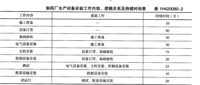 某安装公司承包某制药厂生产设备工程的施工,该制药厂生产设备的主机及控制设备由建设单位从国外订货。制药厂生产设备的主机设备土建工程及机电配套工程由某建筑公司承建,已基本完工。安装公司进场后,按合同工期要求,与建设单位和制药厂生产设备主机及控制设备供应商洽谈,明确了设备主机及控制设备到达施工现场需60天。安装公司依据工程的实际情况编制了该制药厂生产设备工程的施工进度计划(双代号网络图),其中该制药厂生产设备工程的安装工作内容、逻辑关系及工作持续时问见表1H420080--2。