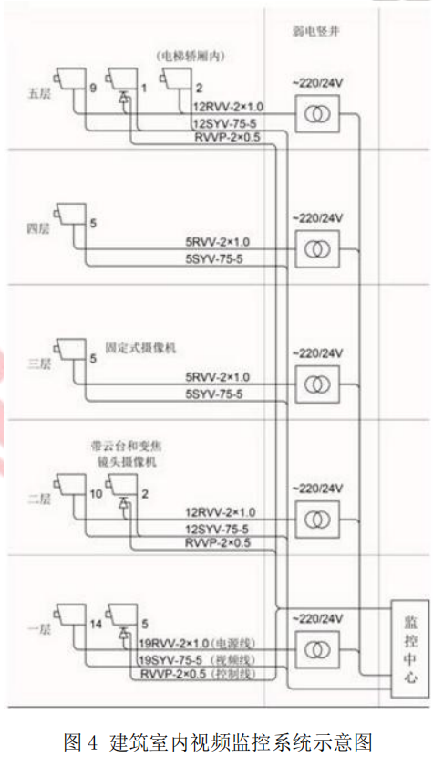 某商业中心有15栋多层建筑,该商业中心的建筑智能化工程包括:建筑设备监控体系、安全技术防范系统、公共广播系统、防雷与接地和机房工程。某安装公司承接该工程后,对安全技术防范系统进行施工图深化设计,其中一栋建筑室内视频监控系统如图4所示。