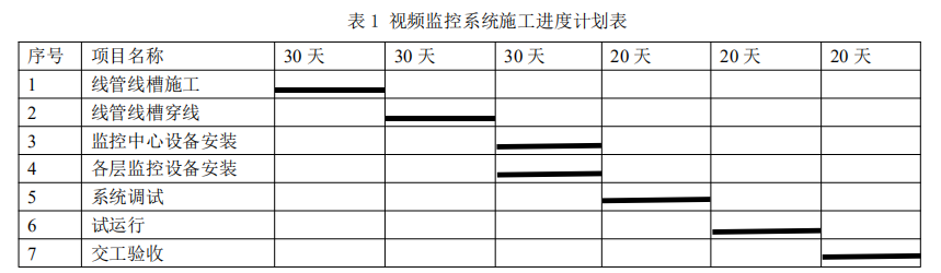 安装公司项目部进场后,依据商业中心工程的施工总进度计划,编制了安全技术防范系统施工进度计划,其中视频监控系统施工进度计划见表1。该进度计划在报公司审批时,被公司总工程师否定,调整后通过审批。