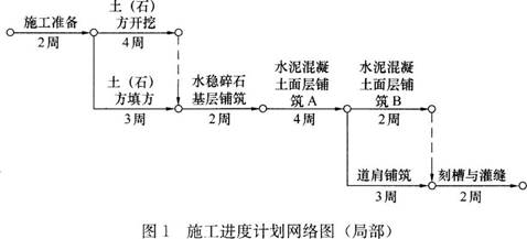 2.依据图1指出该建设任务的关键工作并计算水泥混凝土面层铺筑B的工作总时差。