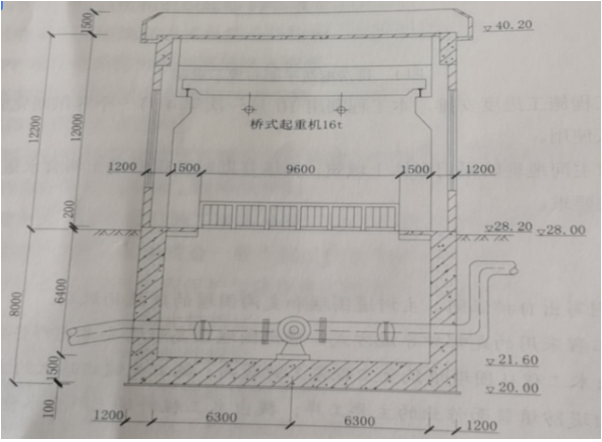 某施工单位承担江北取水口加压泵站工程施工,该泵站设计流量5.0m³/s,站内安装4台卧式双吸离心泵和1台最大起重量为16t的常规桥式起重机,泵站纵剖面如图2所示,泵站墩墙、排架及屋面混凝土模板及脚手架均采用落地式钢管支撑体系。施工场区地面高程为28.00m,施工期地下水位为25.10m.施工单位采用管井法降水,保证基坑地下水位在建基面以下:泵站基坑采用放坡式开挖,开挖边坡1:2.。施工过程中发生如下事件: