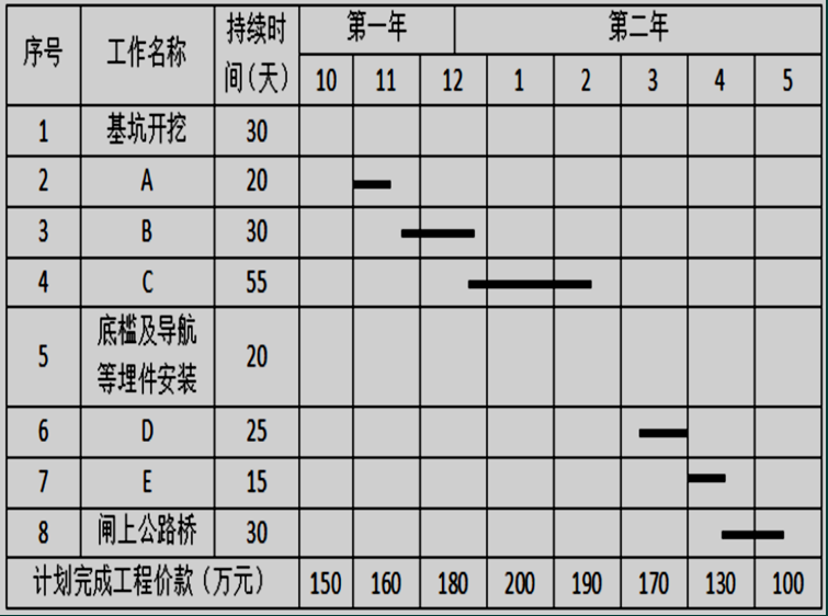监理人向承包人发出的开工通知中载明的开工时间为第一年10月1日。闸室施工内容包括基坑开挖、闸底板垫层混凝土、闸墩混凝土、闸底板混凝土、闸门安装及调试、门槽二期混凝土、底槛及导轨等埋件安装、闸上公路桥等项工作,承包人编制经监理人批准的闸室施工进度计划见图3(每月按30天计,不考虑工作之间的搭接)。