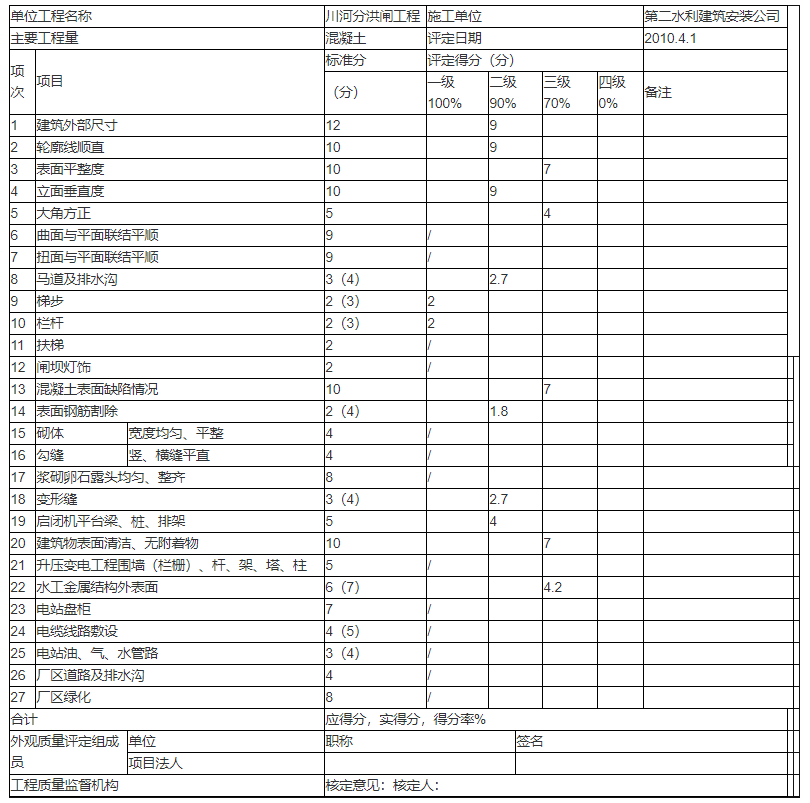 评定组对工程外观质量进行了评定,部分评定结果见水工建筑物外观质量评定表(表1)。单位工程质量评定的其他有关资料如下: