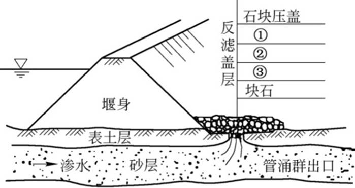 事件1:上游围堰背水侧发生管涌,施工单位在管涌出口处采用反滤层压盖进行处理。反滤盖层材料包括:块石、大石子、小石子、粗砂等,如下图所示。