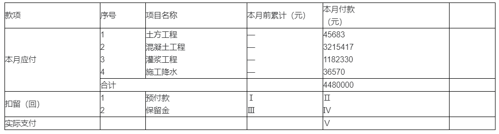 事件4:至2018年3月,施工累计完成工程量2700万元。4月份的月进度付款申请单见下表。