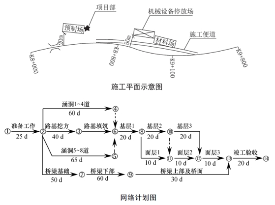 施工单位进场后,积极组织施工,并将路面分成三个段落组织流水作业,并绘制了施工平面布置示意图和网络计划,分别如下: