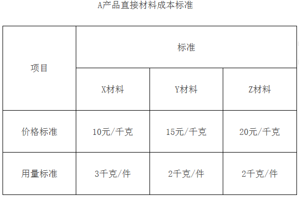 资料二:生产A产品需要耗用X.Y.Z三种材料,其价格标准和用量标准如下表所示。