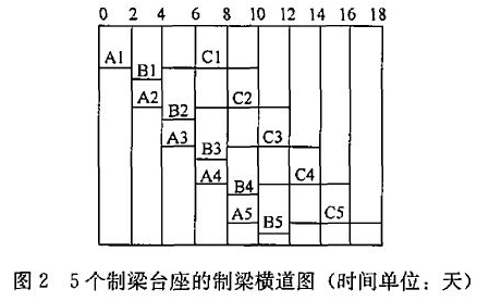预制场设5个制梁台座(编号1~5),采用一套外模、两套内模。每片梁的生产周期为10天,其中A工序(钢筋工程)2天,B工序(模板安装、混凝土浇筑、模板拆除)2天,C工序(混凝土养护、预应力张拉与移梁)6天。5个制梁台座的制梁横道图见图2所示。