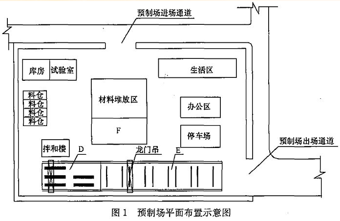 施工合同签订后,施工单位根据构件预制场的布设要求,立即进行了箱梁预制场的选址和规划,并编制了《梁场布置方案》,在报经企业技术负责人审批后实施,方案要求在梁板预制完成后,移梁前应对梁板喷涂统一标识,包括预制时间、梁体编号等内容,预制场平面布置示意图见图1所示。