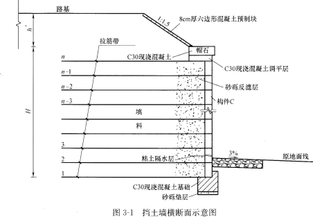 某施工单位承建了一段路基工程,其中K18+220~K18+430设置了一段挡土墙,路基填方高度为11m。挡土墙横断面示意图如下: