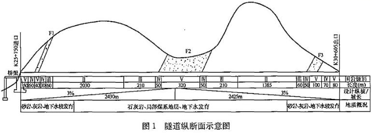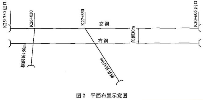 左右隧道分别长4855m,中线间距30m,隧道最大埋深850m,纵坡为3%人字坡,其地质条件为:岩性为砂岩、石灰岩,局部有煤系地层;瓦斯含量低,属低瓦斯隧道;穿越F1、F2、F3三条断层;地下水发育。左右洞围岩级别均为:Ⅱ级3415m,Ⅲ级540m,IV级310m,V级590m。在距进口2100m(对应里程K27+850)处设计了一座斜井,斜井长450m,向下纵坡5~8%,隧道纵断面示意图及平面布置示意图分别见图1、图2。
