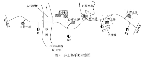 施工单位拟定了A、B、C、D四个弃土场,弃土场平面示意图如图2所示,施工单位会同有关单位到现场查看后决定放弃B、C弃土场,采用A、D两个弃土场。弃土按设计要求碾压密实,压实度要求达到90%。经测算,A弃土场可弃土方15000m3(压实方),D弃土场可弃土方20000m3(压实方)。