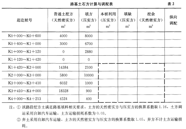 施工单位进行了路基土石方计算与调配,路基土石方数量计算与调配见表2。