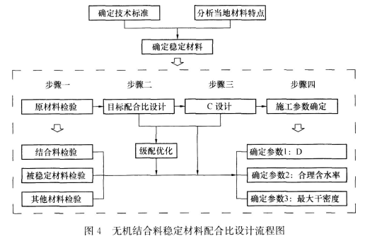 事件2:施工单位在基层施工前,进行了各项标准试验,包括标准击实试验、B试验、混合料的配合比试验、结构强度试验等,其中路面基层无机结合料稳定材料配合比设计流程图如图4所示。